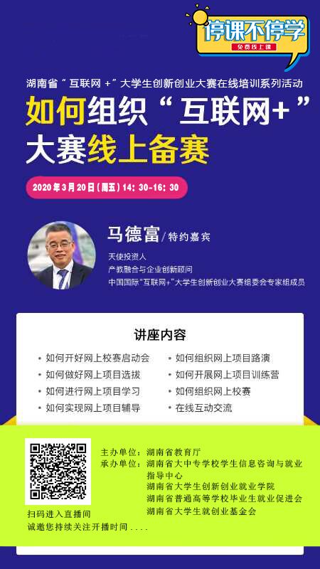 湖南省“互联网+”老员工创新创业大赛组委会将从本周开始进行创新创业大赛线上培训,大赛组委会秘书处将邀请全国知名专家以在线互动等形式,指导全省各高校开展创新创业公司产品和训练实践,做好”第六届中国国际‘互联网+’创新创业大赛“全国选拔赛的备赛工作,请大家准时收看。课程预告: