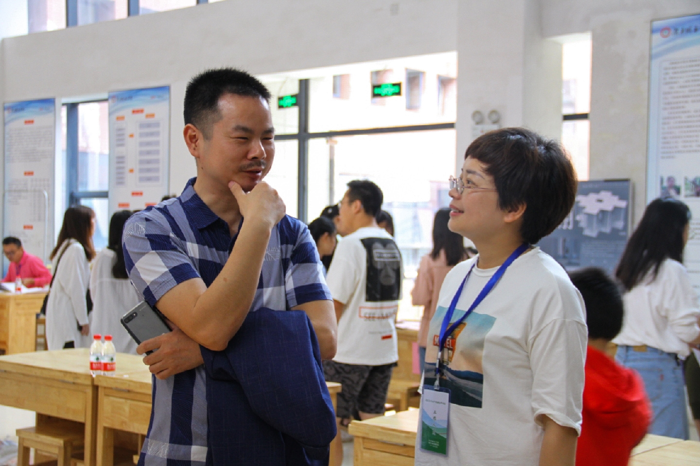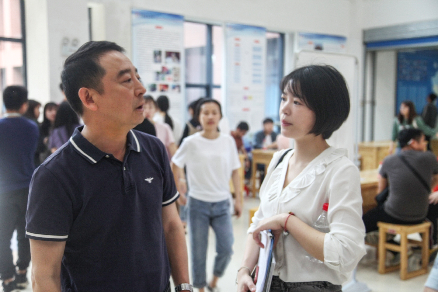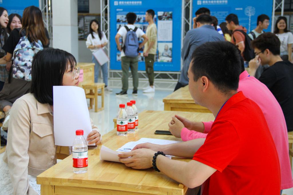 2019年5月12日早8:30,beats365官方网站乘着2019beats365官方网站建筑类专业产教融合研讨会的东风,于建筑规划楼二楼中厅举行各用人单位招聘交流会。公司党委书记项龙武、党委副书记郭绚霞和学工办老师们组成的“服务团”,为毕业生就业提供政策咨询、心理咨询和就业指导等服务。