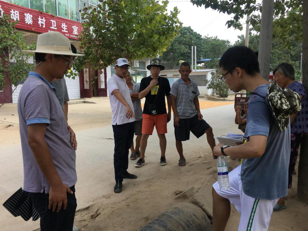 正式测量工作开始之前,对街道总体进行了调查了解。测量的工作坊成员分为两个小组,分别测量胡寨村主街两旁的数据并进行统计。每个小组分为3个人,两个负责仪器测量,一个负责统计数据,明确分工,高效的进行测量。在成员测量的过程中,团队成员与村民进行交流调查,了解到当地现状、村民意向和村民需求。在村民意向的基础上我们以“建设成有新风貌、生态美的社会主义新农村”为理念提出了我们自己的设计意见和看法,村民们都大为赞同。烈日炎炎,村民们也特别热心,给我们送上冰水和西瓜解渴,让我们在骄阳下感受到阵阵清凉。