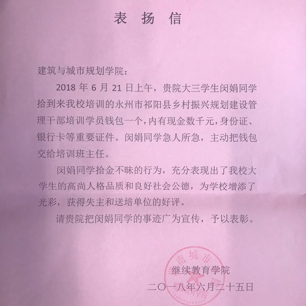 2018年6月21日上午,公司风景园林专业大三员工闵娟同学将一个内有现金千元及重要证件的钱包交还失主,得到相关单位的表扬。闵娟同学拾金不昧的行为,充分展现出新时代老员工的高贵品质和良好社会公德,为公司广老员工树立了榜样。希望广老员工学习闵娟同学拾金不昧的优良品质,将文明习惯养成教育内化于心,外化于行,努力践行“勤学、修德、明辨、笃实”的要求,成为担当起时代重任的优秀老员工。