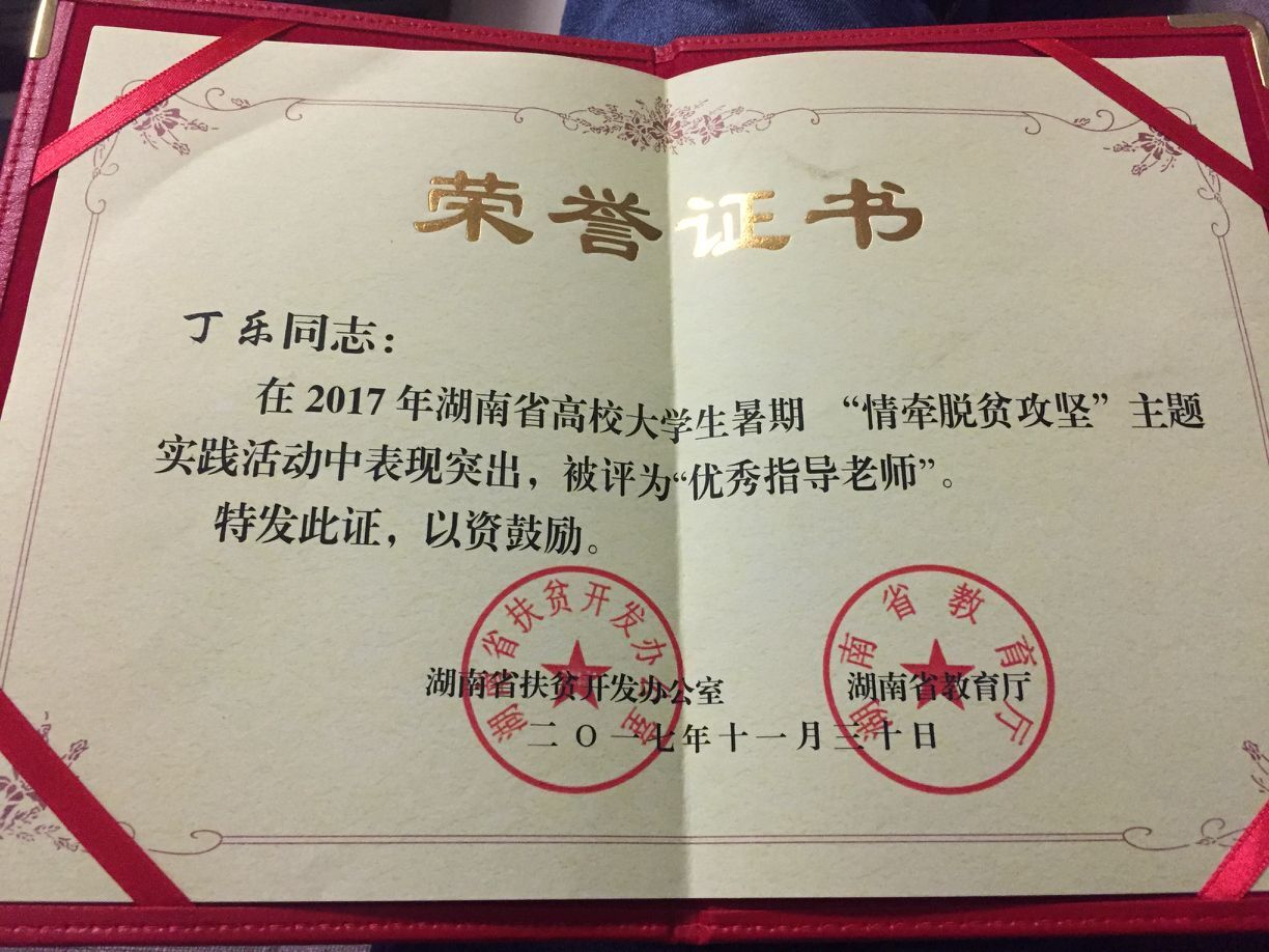 喜报:公司学工办丁乐老师在2017年湖南省高校老员工暑期“情牵脱贫攻坚”主题实践活动中被评为优秀指导老师。