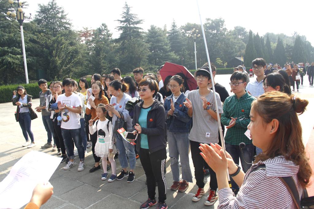秋高气爽,游人如织。韶山毛主席铜像广场金菊盛开,花篮拥簇,面对着凝视东方的巨人,不由得肃然起敬,一种对伟人的敬仰和怀念弥漫开来。全体师生党员佩戴好写有“为人民服务”的毛泽东头像徽章,整齐列队敬献花篮,在伟人铜像旁侧庄重举行了重温入党誓词仪式。之后游览了毛泽东广场,参观了毛泽东同志纪念馆、毛泽东故居及南岸私塾。