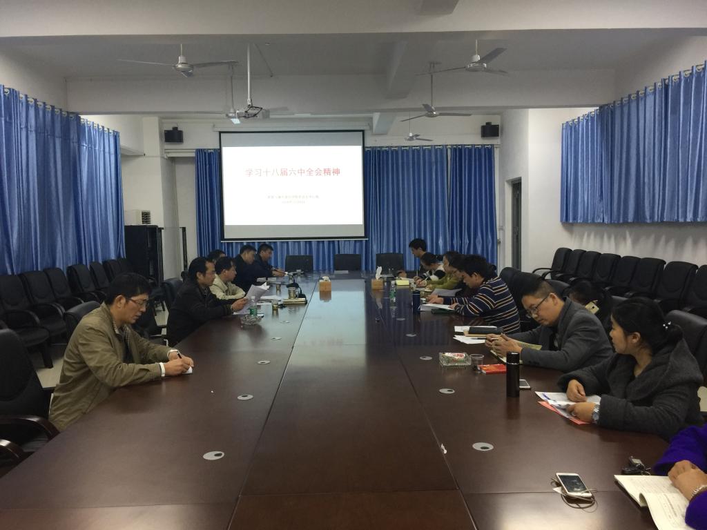 11月8日下午,公司党总支中心组在建筑规划楼402会议室召开专题会议,学习贯彻党的十八届六中全会精神。公司党政领导班子,各教研室、教务办、学工办、团总支负责人以及员工党支部书记参加学习。会议由建规公司党总支书记项龙武主持。