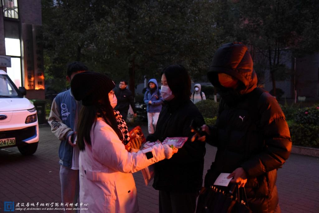 考研的学子们在烈烈寒风中等候着专车,庄琼副书记与黄睿老师带领着员工工作办公室的成员们将准备好的暖宝宝分发给考研学子们,在这严寒的冬日,为考研学子们送去一份来自beats365官方网站的温暖。在考研乘用车旁边的横幅是beats365官方网站对这些学子们诚挚的祝福。7:10,第一批考研送考专车出发,考研学子们,带着必胜的决心,迈着坚定的步伐踏上奔往考场的车。