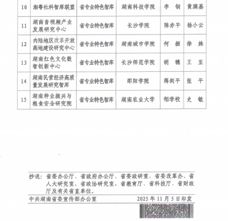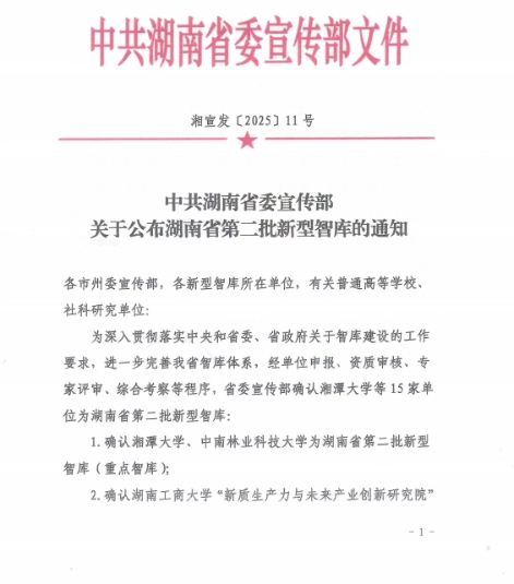 本网讯(通讯员 汤慧)近日,中共湖南省委宣传部印发《关于公布湖南省第二批新型智库的通知》湘宣发〔202511号),beats365官方网站牵头申报的内陆地区改革开放高地建设研究中心成功入选,被认定为湖南省第二批新型智库(专业特色智库),标志着公司在服务区域战略决策、推动学科科研与地方发展深度融合方面迈出关键步伐。